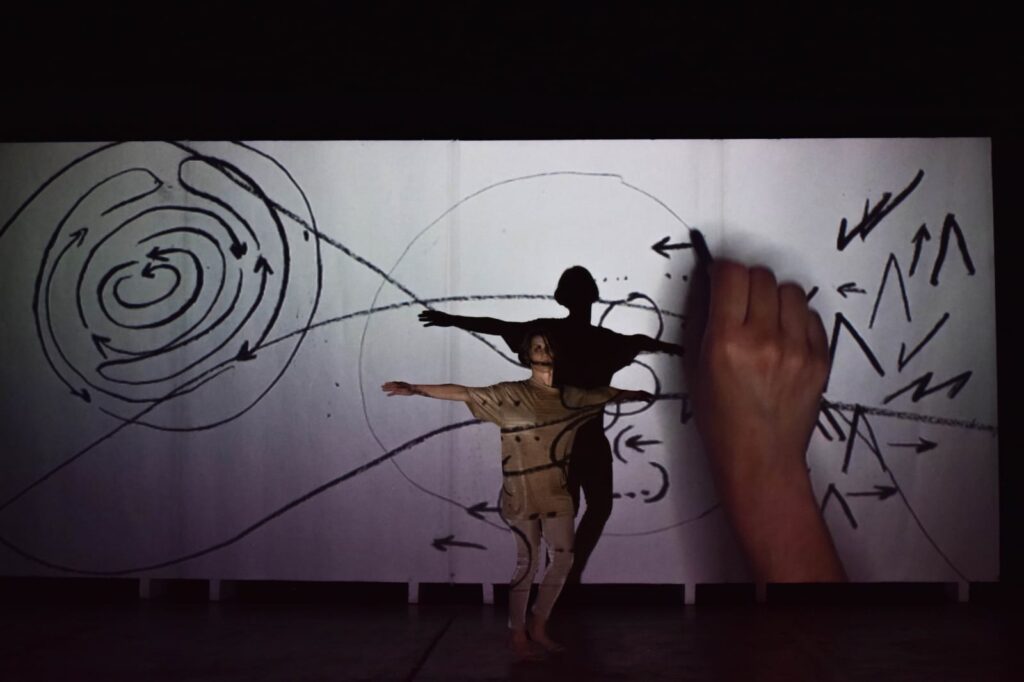 El vestuario, a cargo de Florencia Macché, va cambiando, acompañando las distintas etapas que transita la protagonista. Se usan, al principio, colores cálidos, y luego hay uso predominante del negro. En la primera escena Inés tiene un vestuario dorado que, bajo la luz tenue, brilla de un modo particular, permitiendo que, a la vez que se proyecta su figura en la pantalla, su cuerpo sea cubierto por las líneas y puntos que Liz Varela dibuja. El uso de la luz, diseñado por Adrián Grimozzi, se va oscureciendo a lo largo de la obra, hallándose, al final, una predominancia de colores fríos y momentos de sombra. Cuando salí de la sala, lo primero que pensé, recordando la idea de Yvonne Rainer*, fue que en Materia bruta no hay artimañas que busquen seducir al espectador. O, si las hay, son demolidas por nuevos interrogantes que plantea la obra.