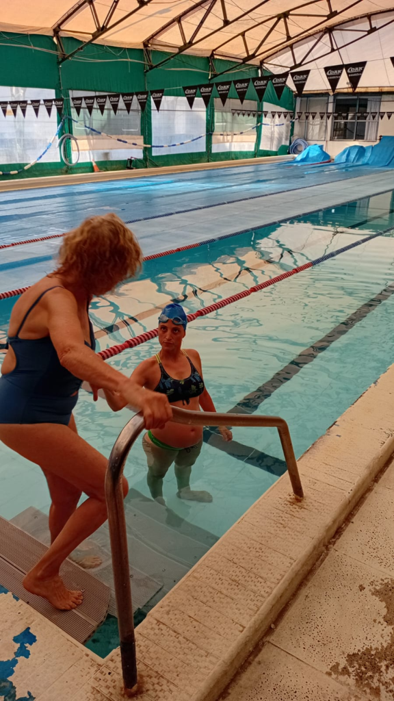 Patricia entra a la pileta del club Carriego de la mano de su hija Bárbara. Foto: Sol Maguna.